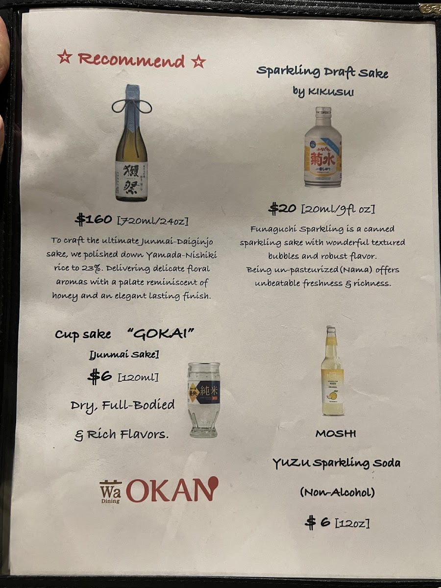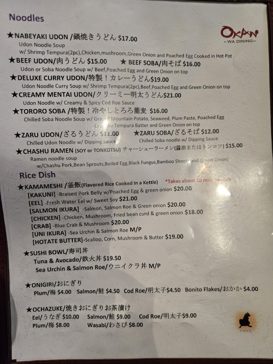 The menu at Wa Dining Okan features a variety of traditional Japanese dishes with a focus on fresh seafood, grilled items, and comforting rice dishes. It is organized into several key sections to help guide diners through their options.