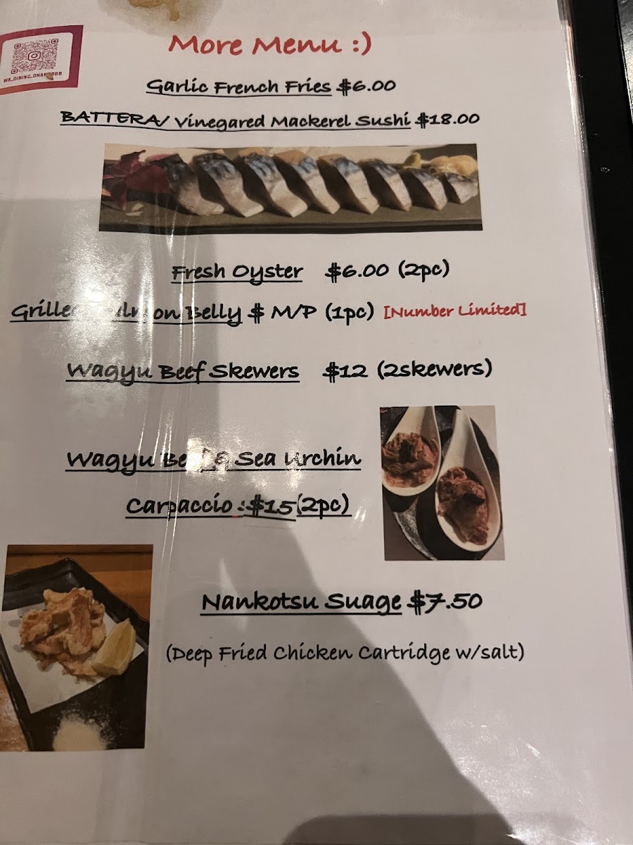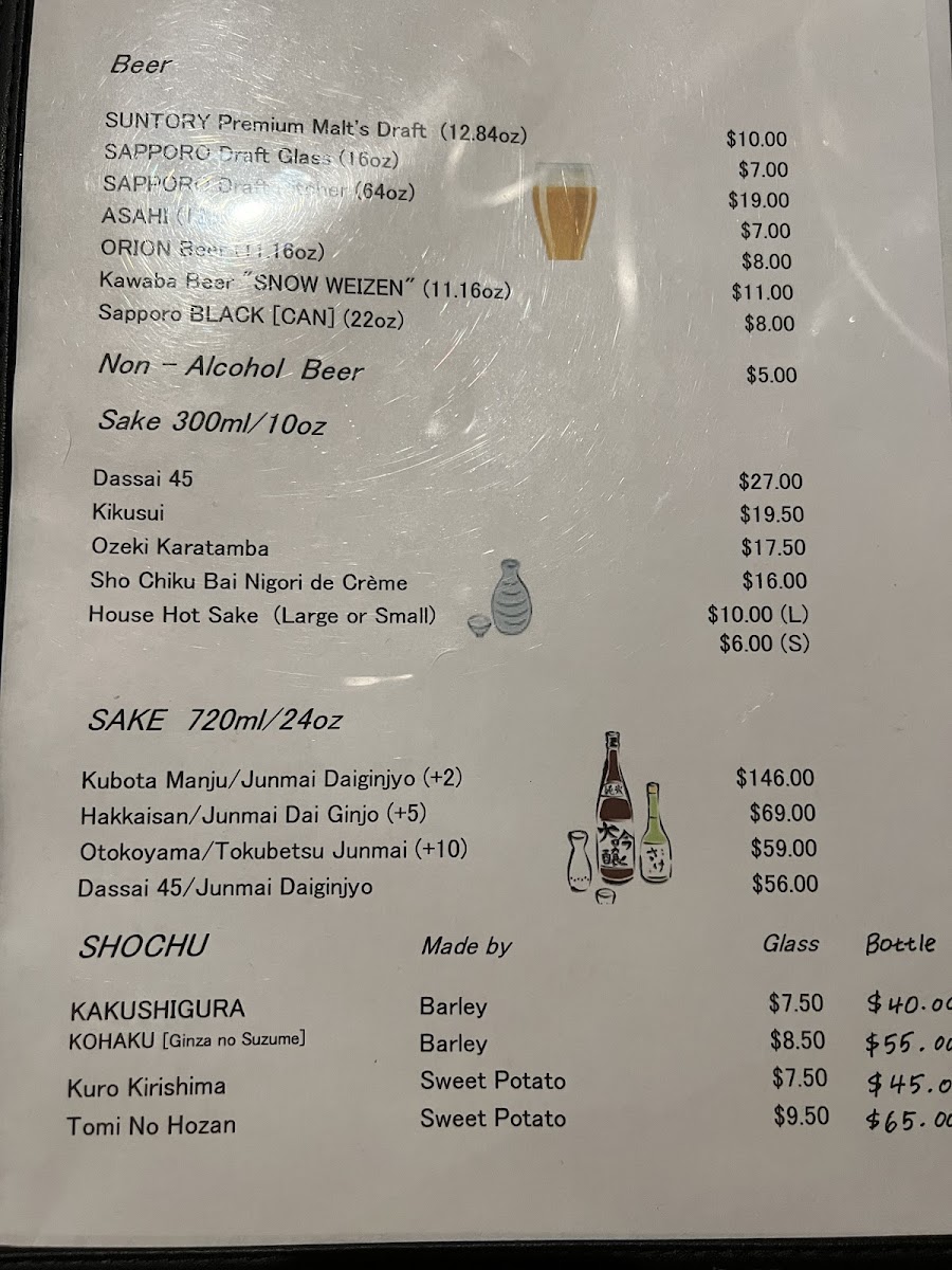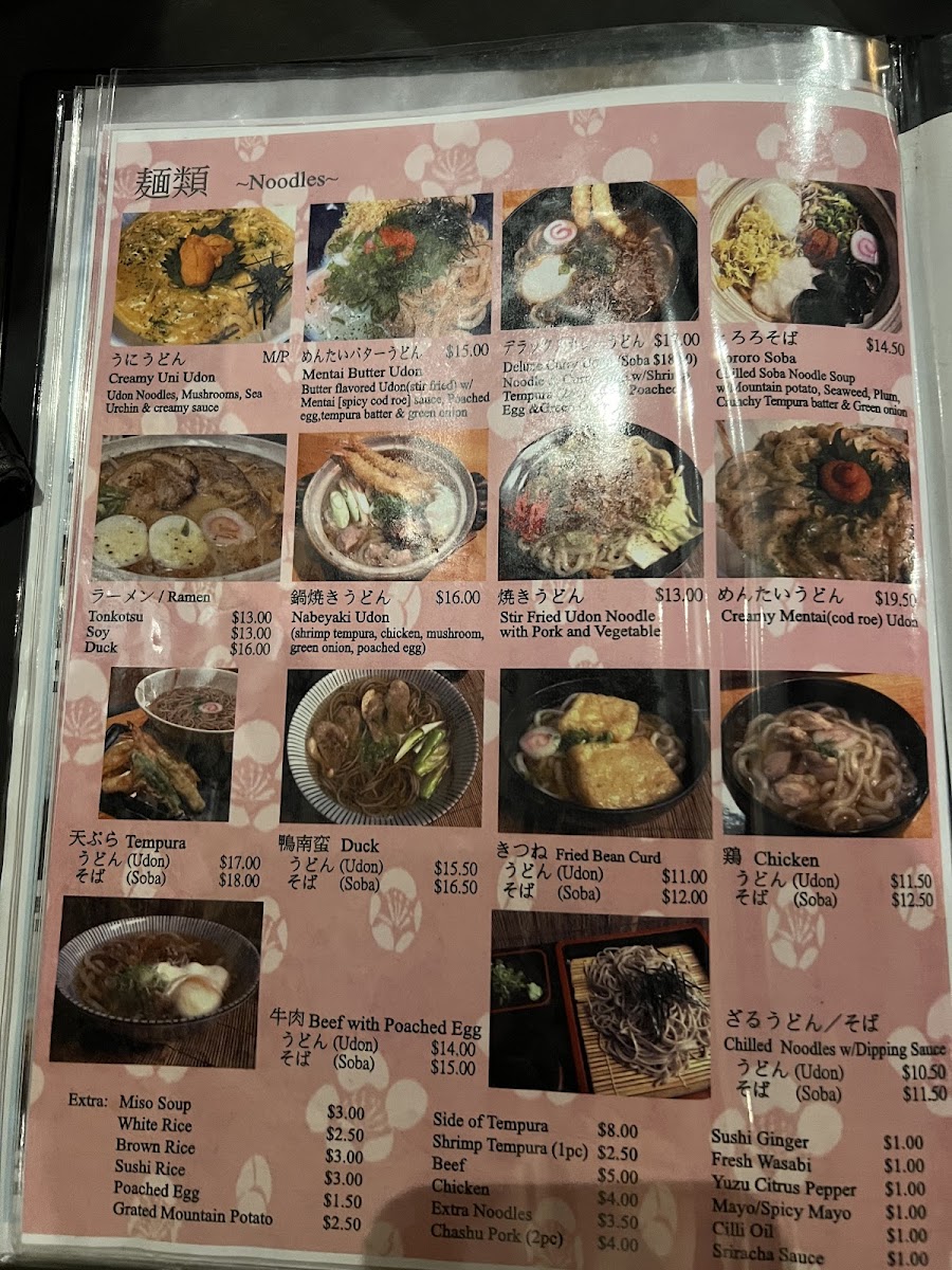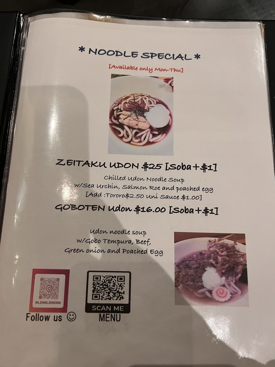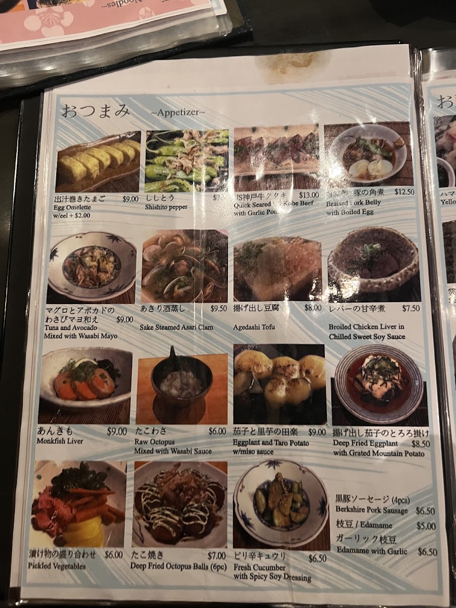 - Specialty Items: Highlighted dishes include yakitori skewers, raw scallops with sea urchin uni, nabeyaki udon, sukiyaki bento boxes, and seasonal tempura assortments. There are also several seafood-focused options like takoyaki (fried octopus), yellowtail collar, sashimi salad, and wagyu beef skewers.