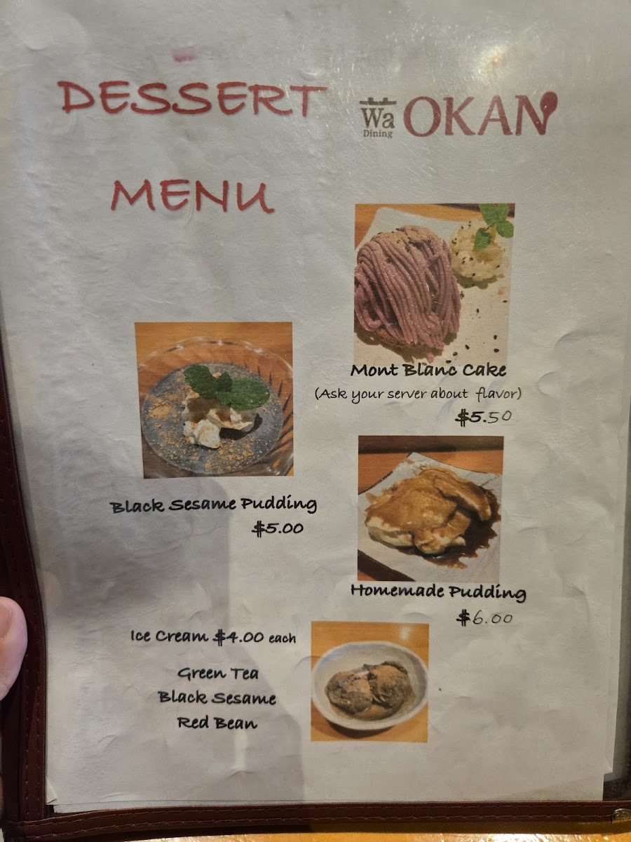 - Desserts: The dessert offerings include choices such as black sesame ice cream or pudding, providing a traditional sweet finish to the meal.